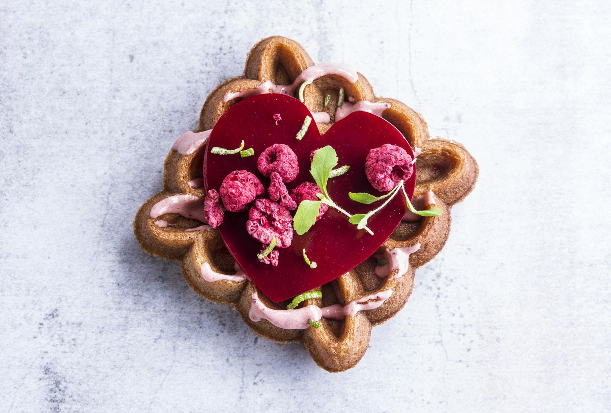 Wafel met Valentijn crème, hartje in gelei, gevriesdroogde frambozen, limoenzeste, honingcress