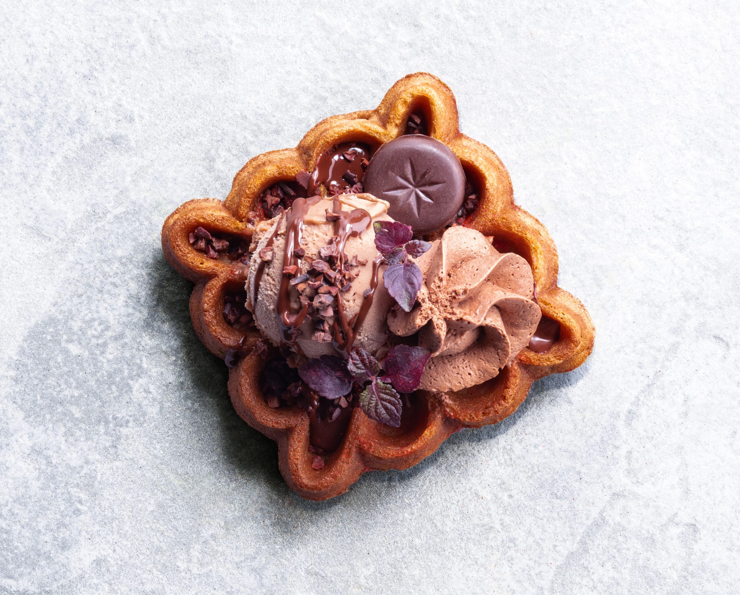Wafel met huisgemaakte donkere chocoladesaus, chocolademousse, bolletje chocolade ijs, cacaonibs, stuk donkere Belgische chocolade.
